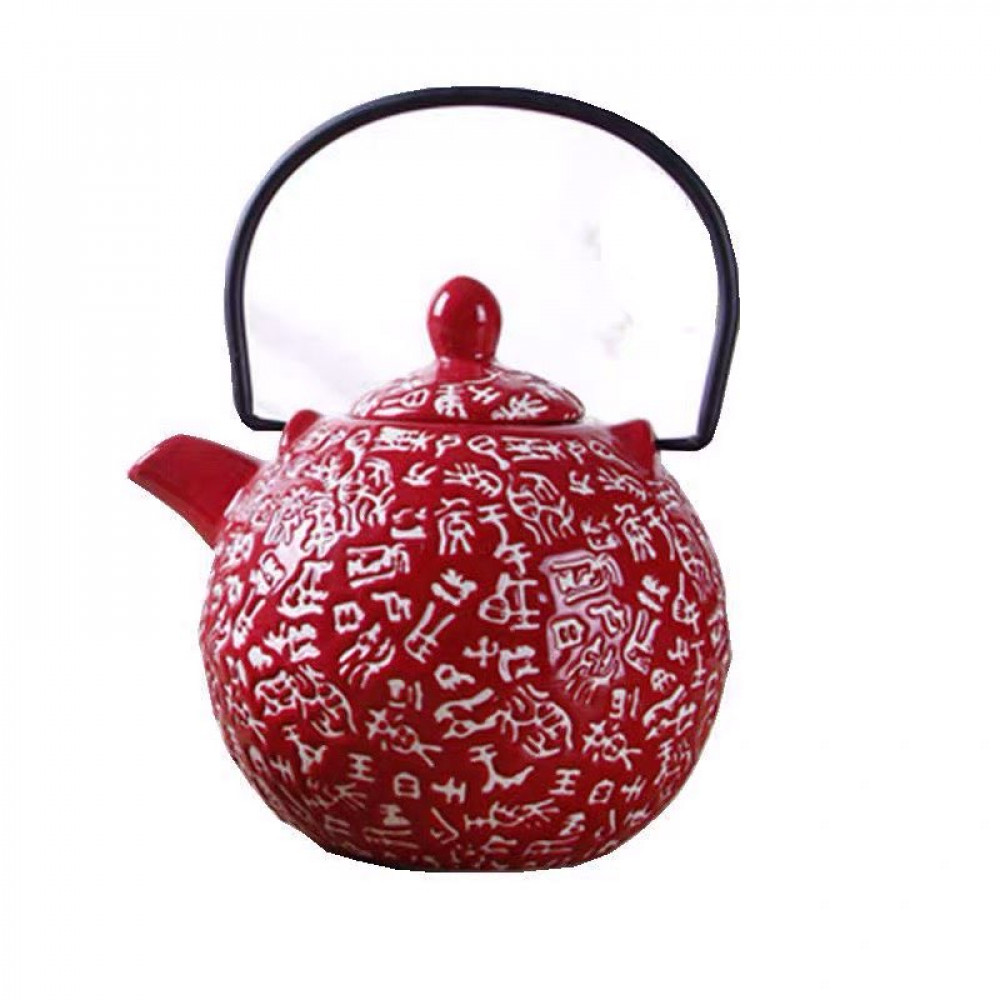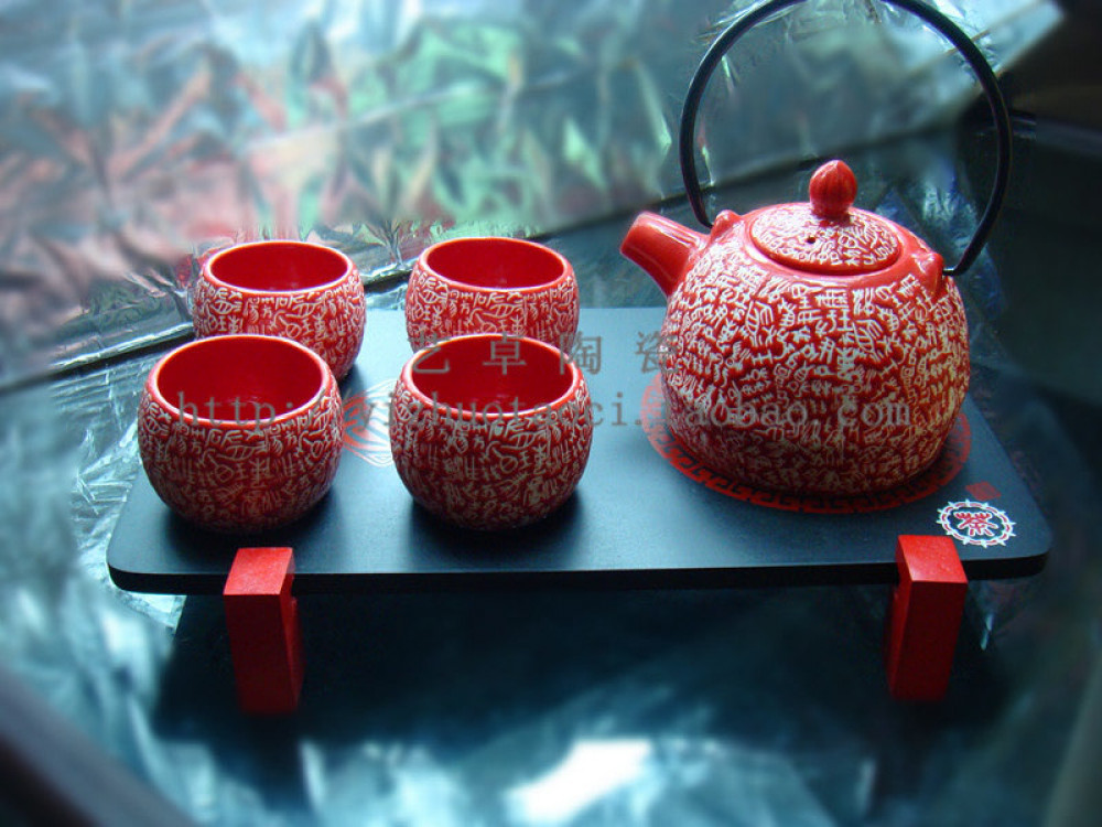طقم شاي اللون احمر مكون من 6 قطع مزخرف باللون ابيض